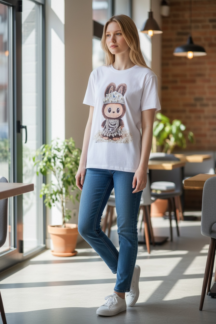 Dale un giro sofisticado y femenino a tu look casual con esta t-shirt blanca de diseño exclusivo, destacada por un encantador print de conejito con corona y detalles tipo joya. Una pieza que combina ternura, estilo y personalidad, perfecta para mujeres que aman marcar diferencia incluso en outfits relajados.