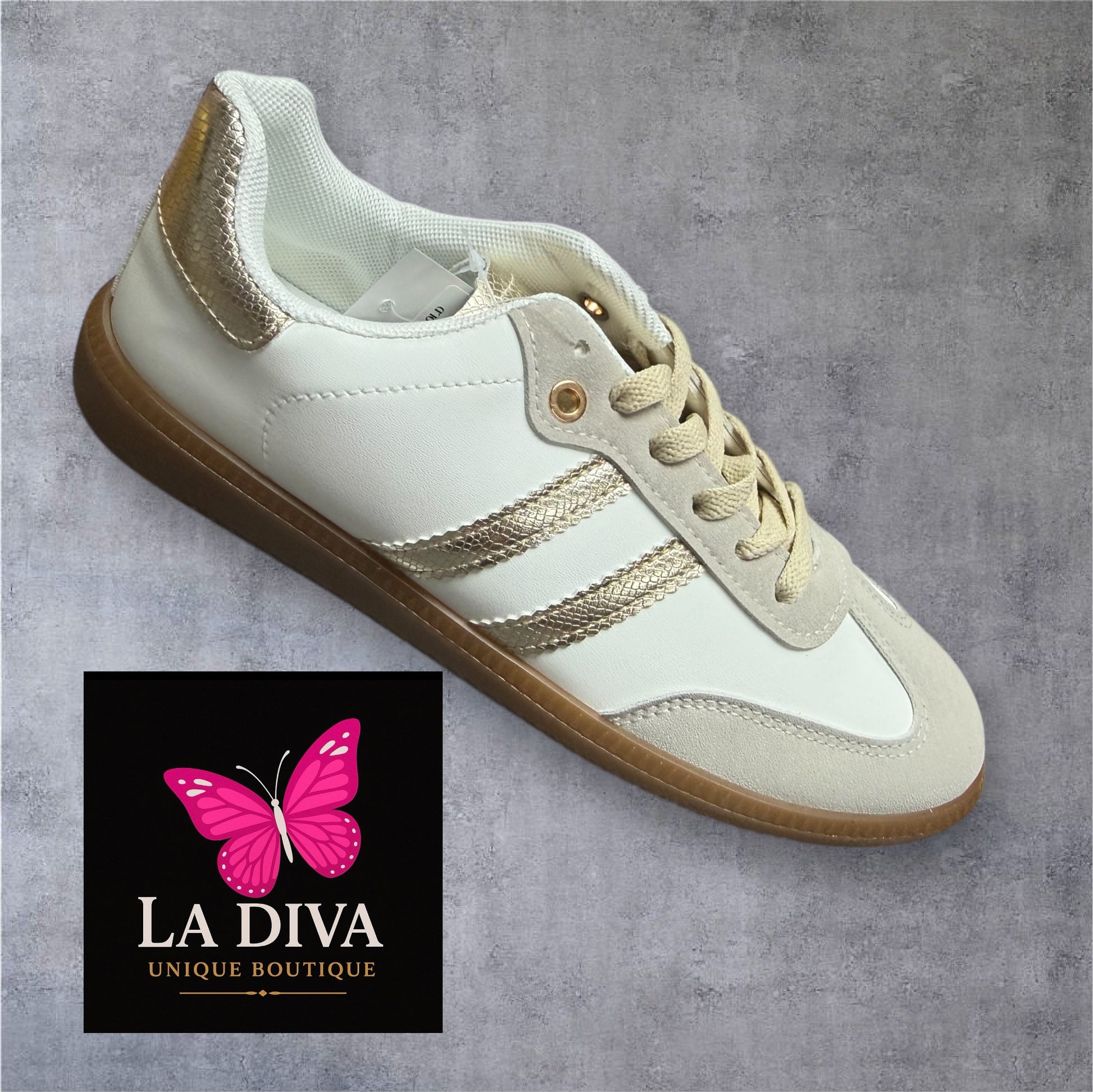 Eleva tu look diario con estos tenis casuales de diseño moderno y sofisticado. Confeccionados en material sintético de alta calidad en tono blanco, incorporan elegantes detalles dorados texturizados que aportan un toque premium y femenino. Su suela color caramelo brinda excelente tracción y estabilidad, ideal para el uso diario sin sacrificar estilo.